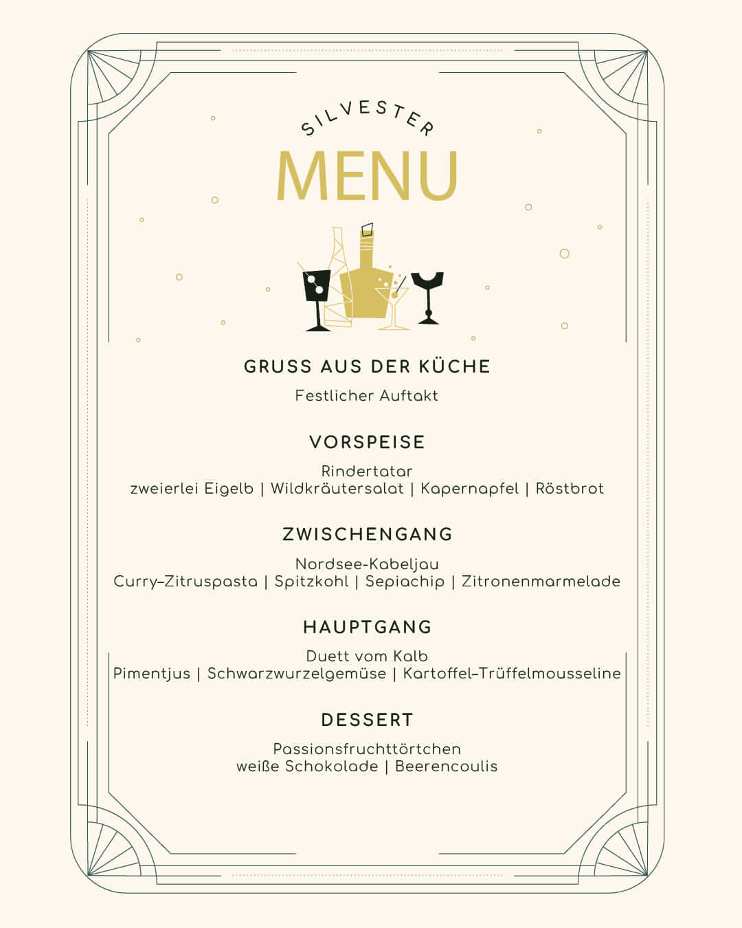 Unser Arrangement für den Jahreswechsel für 2 Personen flexibel für eine oder mehrere Nächte buchbar inkl. 3- oder 4-Gang-Menü ab 317,00 EUR. Hinweis: Das Silvestermenü ist auch ohne Übernachtung über unser Restaurant buchbar | 3-Gang-Menü 61,50 EUR/p.P. | 4-Gang-Menü 82,50 EUR/p.P.